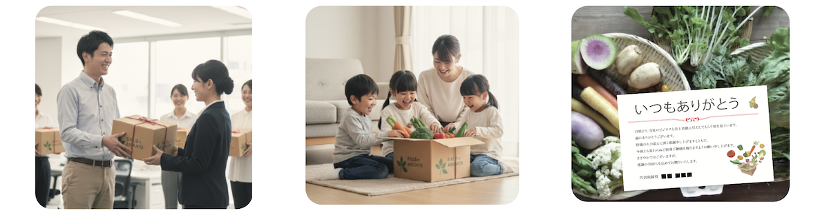 野菜と一緒に、社長や上司からの「感謝のメッセージカード」を同梱。